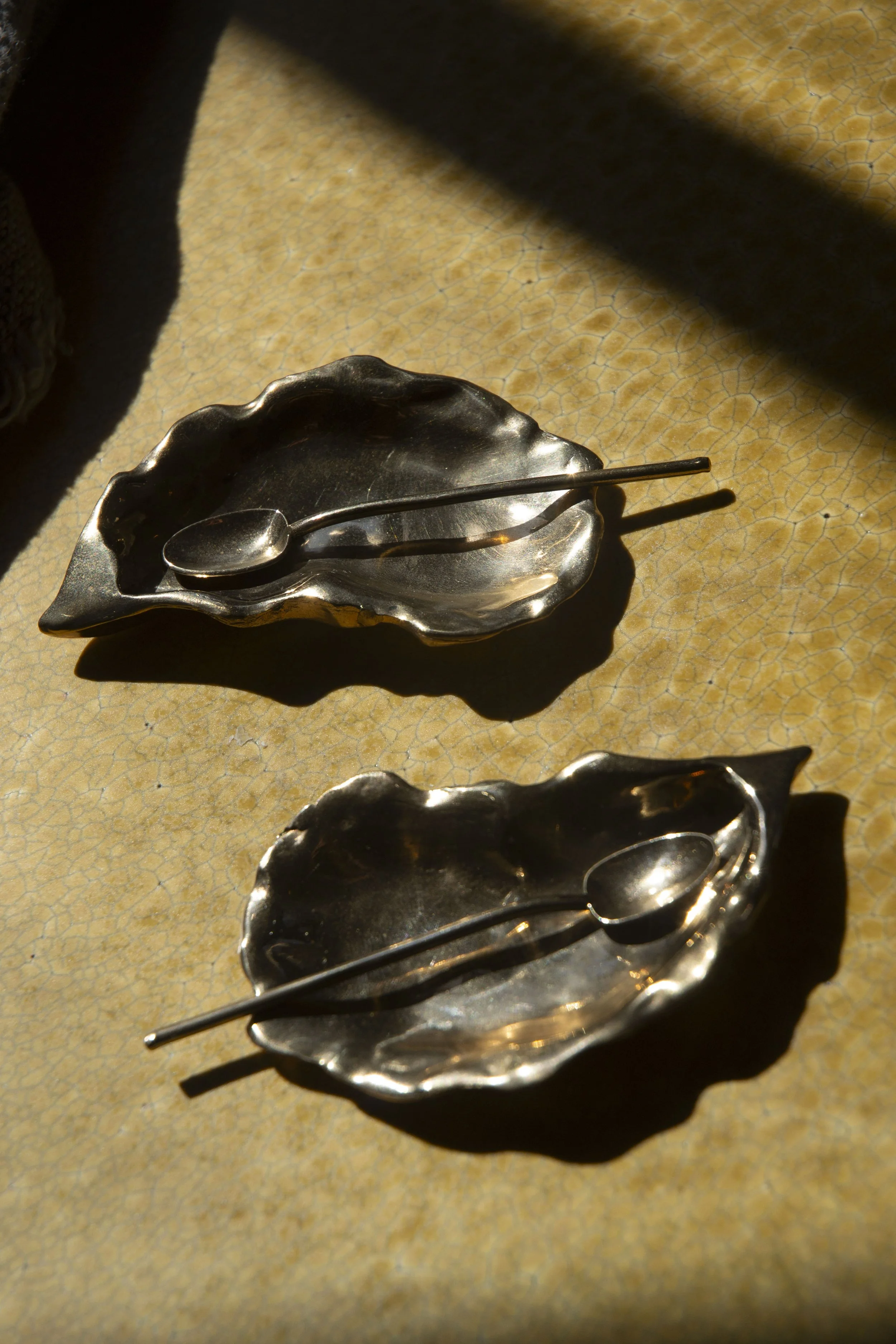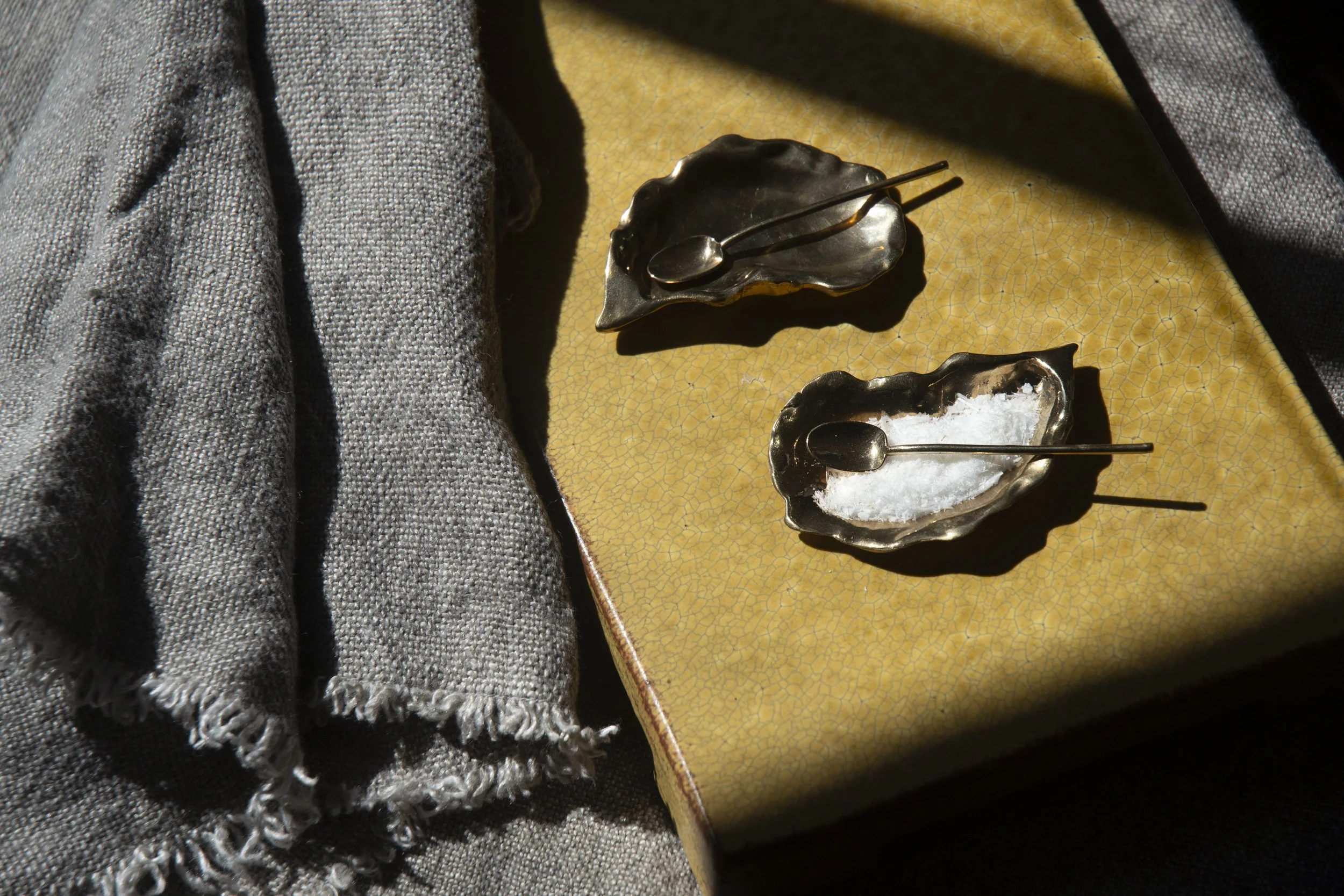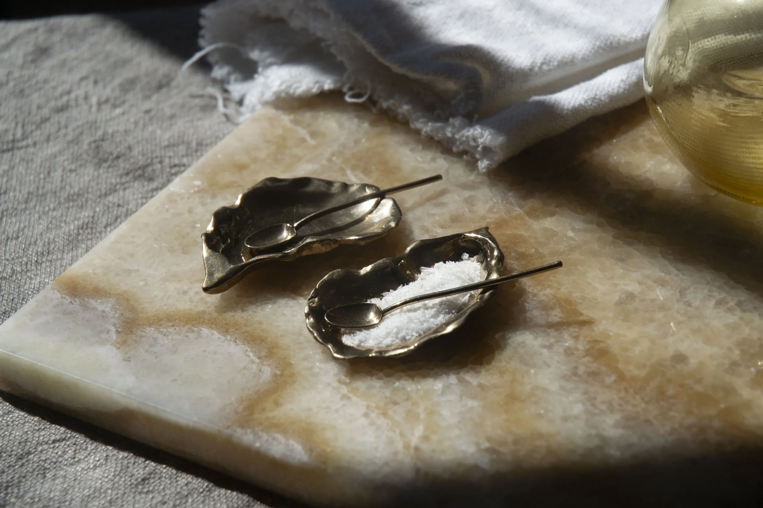 The Oyster Shell and Spoon set elevates the simple act of seasoning into an elegant ritual. Inspired by the natural beauty of the ocean, the hand-cast bronze shell cradles salt or pepper, while the delicately sculpted spoon adds a refined touch. Perfect for dining or display, this set brings organic charm and timeless sophistication to your table."